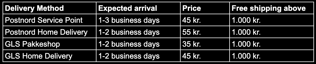 We process and send orders during our main service hours, Monday to Friday from 8.00 AM till 4.00 PM CET (except for Danish public holidays). We aim to handle orders within one business day, but during busy periods, it may take a little longer. Once your order has been shipped, you will receive a shipping confirmation via email.