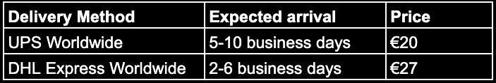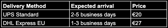 Orders are shipped with different carriers depending on the shipping country and are insured against theft and accidental damage.
